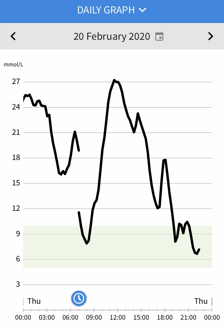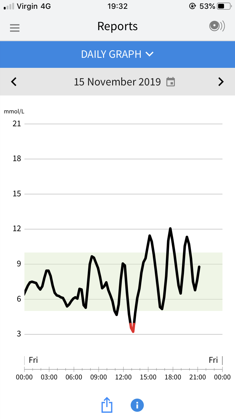 This is an example of a daily graph using my phone. The green area is my aim between 5 to 10, however you can see at certain times my blood sugar rises above and below the target range.